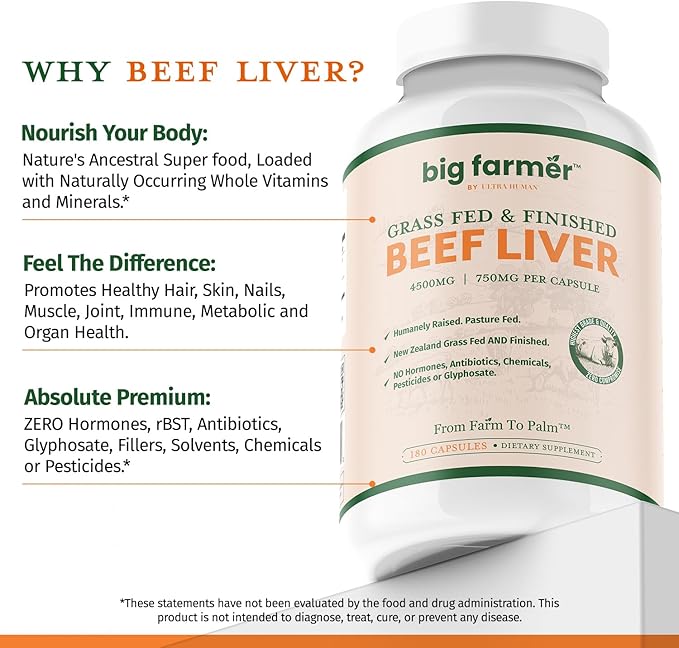Take the BIG FARMER beef liver supplement daily with water. Each serving provides desiccated liver grass-fed nutrients for liver function, organ health, and overall wellness. Follow the recommended dosage for best results.