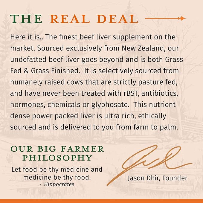 Every bottle of Big Farmer Beef Liver Capsules is made with two non-negotiables: uncompromising quality and a deep respect for nature’s wisdom. We small-batch produce in FDA-registered facilities, triple-test for purity, and freeze-dry at peak freshness—because your health deserves both cutting-edge standards and old-world integrity.
